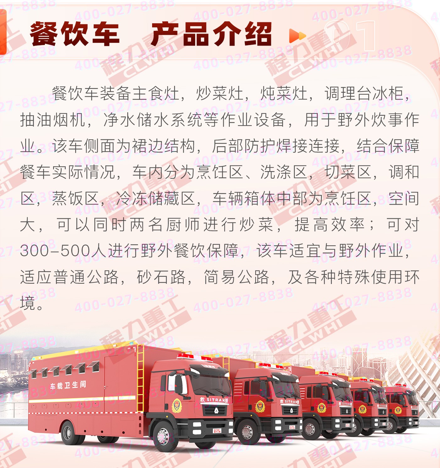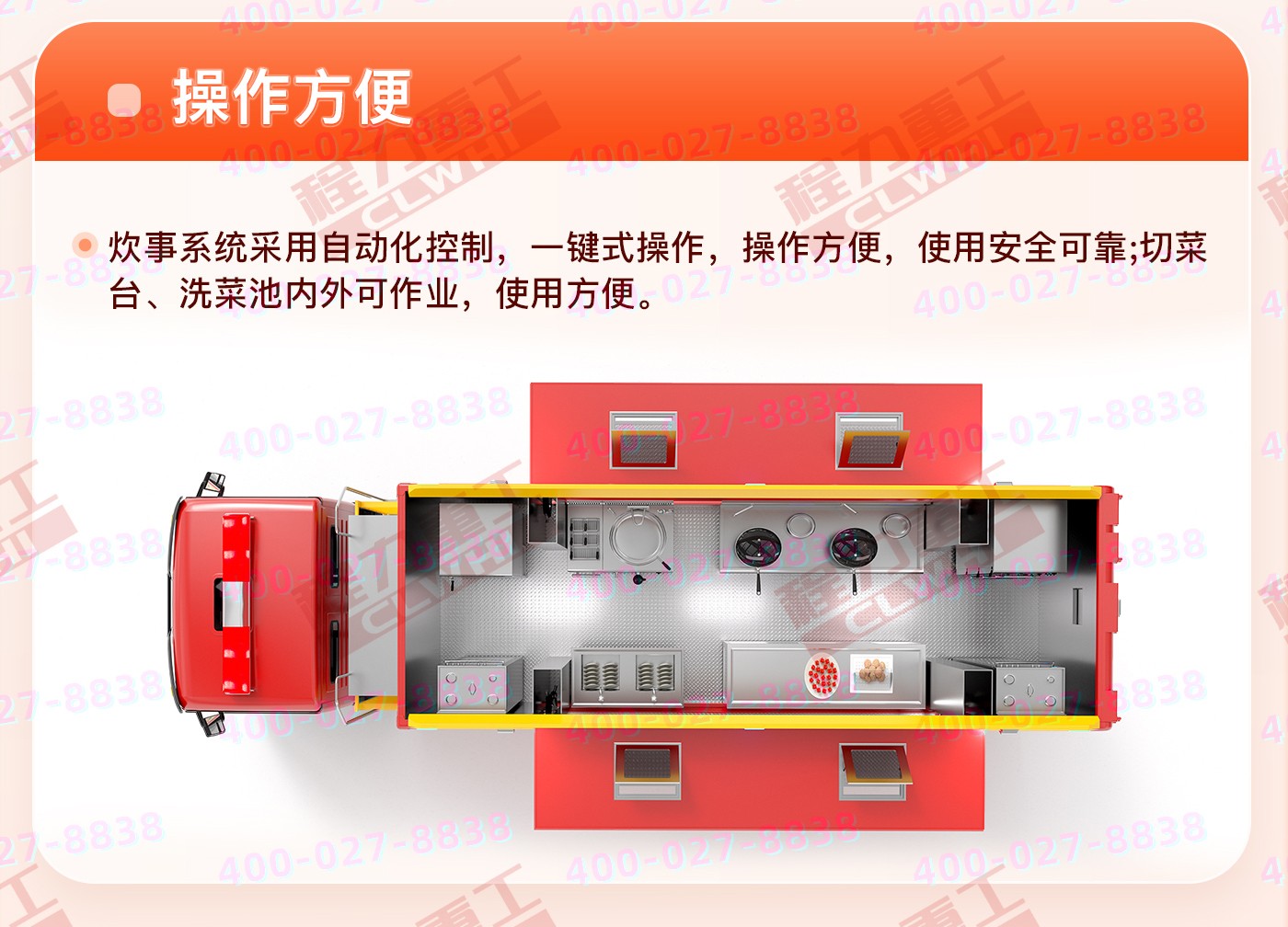 重汽汕德卡飲食保障車集爐、櫥、箱、案與一體,緊湊靈巧;實現了衛生、健康、環保的要求; 功能性等集合為一體。車廂可兩邊展開作為打餐窗口;車廂內飾為不銹鋼,配備不銹鋼爬梯、護欄、凈水箱,污水箱,雙眼灶,蒸飯車,冰箱等。不銹鋼整體壁柜,工作臺,發電機,空調等。該車機動性能好,專業性強,自動化程度高,自然環境適應性強,并能在駐車和行車時進行炊事作業,可保障執行野外任務部隊的飲食和飲水供應。