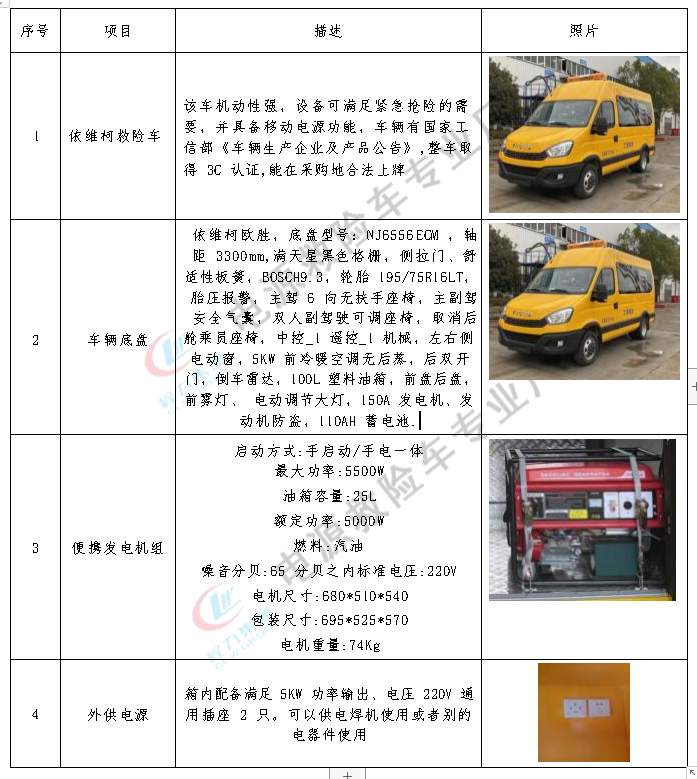車輛搭載夜間照明燈,監(jiān)控?cái)z像存儲(chǔ),數(shù)據(jù)傳輸,音像系統(tǒng),氣體防護(hù)設(shè)備,傷員簡(jiǎn)單救護(hù),氧氣供應(yīng),擔(dān)架急救和辦公語(yǔ)音調(diào)度等現(xiàn)場(chǎng)作業(yè)設(shè)備。額定載客:4-7人。